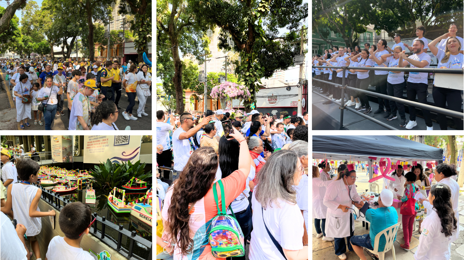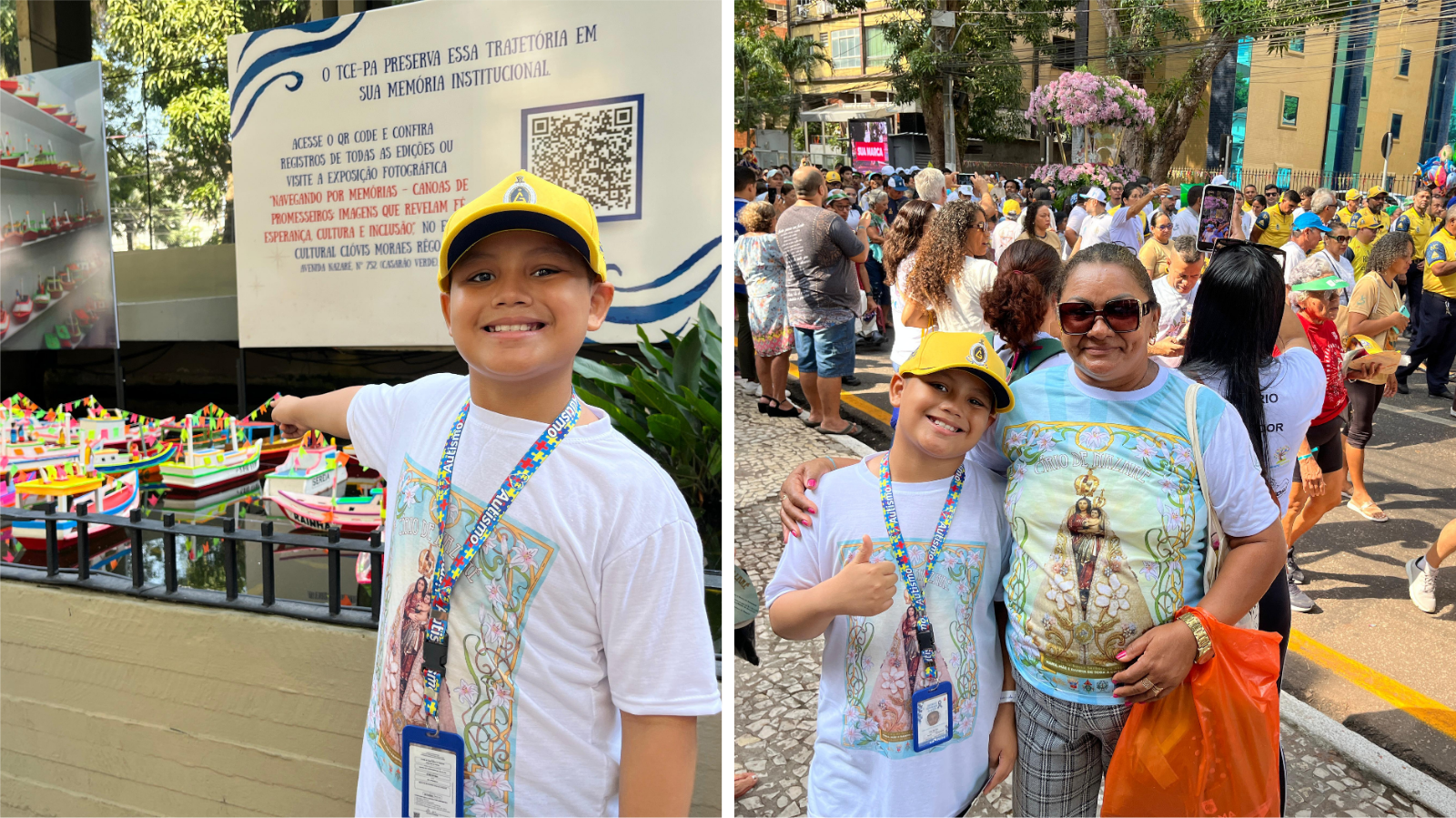 "É uma grande satisfação. Porque isso aqui já é uma graça que alcancei, porque os pais não aceitavam o diagnóstico do meu neto. Ele começou fazer o tratamento com 8 anos e o fato dele vim comportado. Espero que ano que vem eu venha com o outro neto que também é autista. Pedi para a Nossa Senhora que se os pais aceitassem eu viria em quanto tivesse vida. E agora venho no Círio da Acessibilidade", revelou Leonilde Lima dos Reis, avó do Fábio Lucas da Trindade Sousa, de 10 anos, com Transtorno do Espectro Autista (TEA), que aproveitou para acompanhar a exposição “Canoas de Promesseiros” e a apresentação do coral em Libras em parceria com o Instituto Felipe Smaldone.